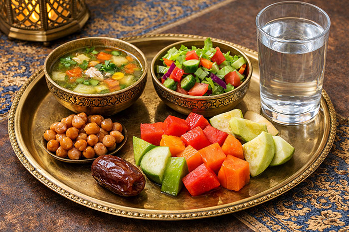 ইফতারে স্বাস্থ্যকর খাবার তালিকা মেনে চললে খেজুর, পানি, সবজি স্যুপ, সালাদ ও ফল দিয়ে সহজেই তৈরি করা যায় সুষম ও পুষ্টিকর ইফতার।