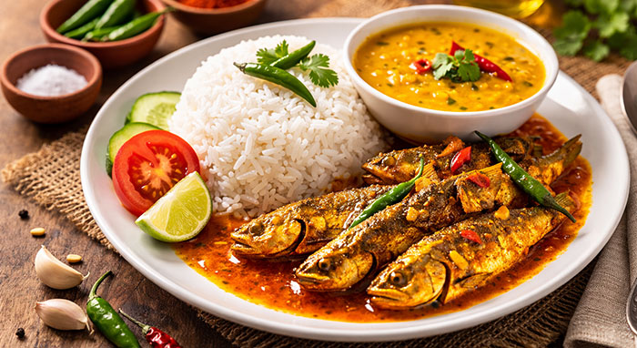 ভাত + ডাল + ছোট মাছ